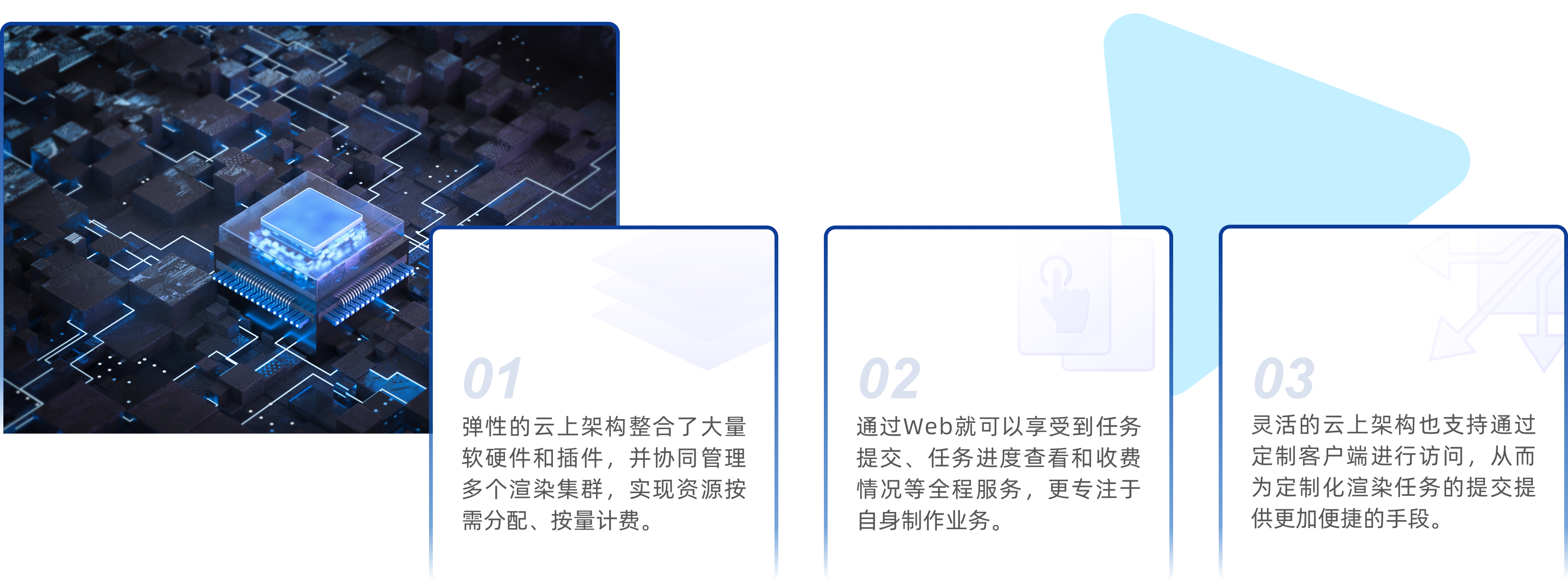 弹性的云上架构整合了大量软硬件和插件,并协同管理多个渲染集群,实现资源按需分配、按量计费。